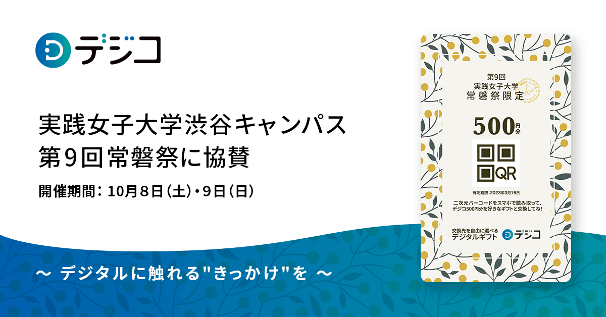 「デジコ」は、10月8日(土)・10月9日(日)の期間中、実践女子大学 渋谷キャンパスで開催される「第9回 常磐祭」内コンテンツの景品として500円分のデジタルギフト「デジコ」の配布を予定しています。