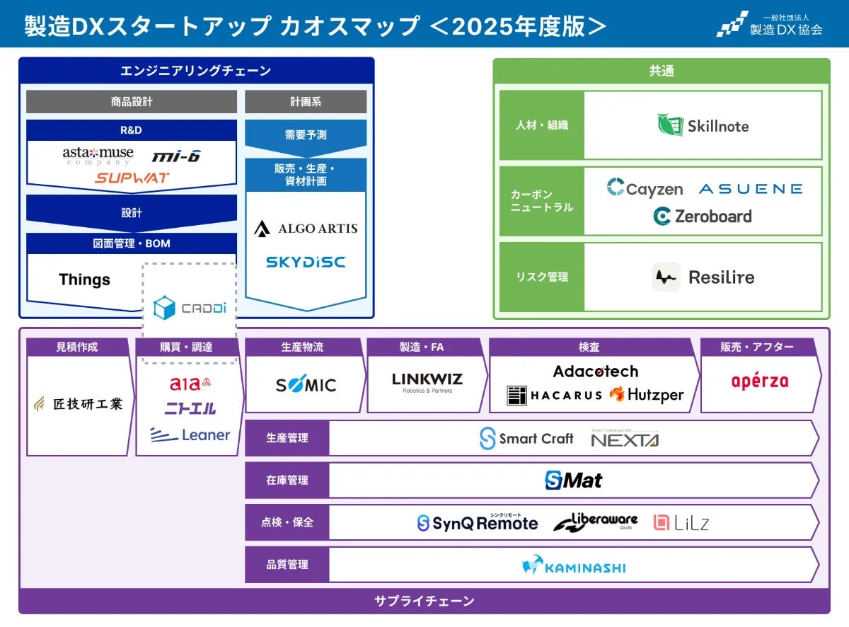 一般社団法人製造DX協会(代表理事:林 英俊、以下「製造DX協会」)から、2025年3月27日(木)に、製造DXに取り組む日本のスタートアップを整理した「製造DXスタートアップ カオスマップ」(以下「本カオスマップ」)が公開され、株式会社Skillnote(本社:東京都千代田区、代表取締役:山川隆史、以下「Skillnote」)が「人材・組織」領域のスタートアップとして掲載されました。Skillnoteからは、代表の山川が協会の正会員として参画し、日本式・製造DXの社会実装を推進しています。