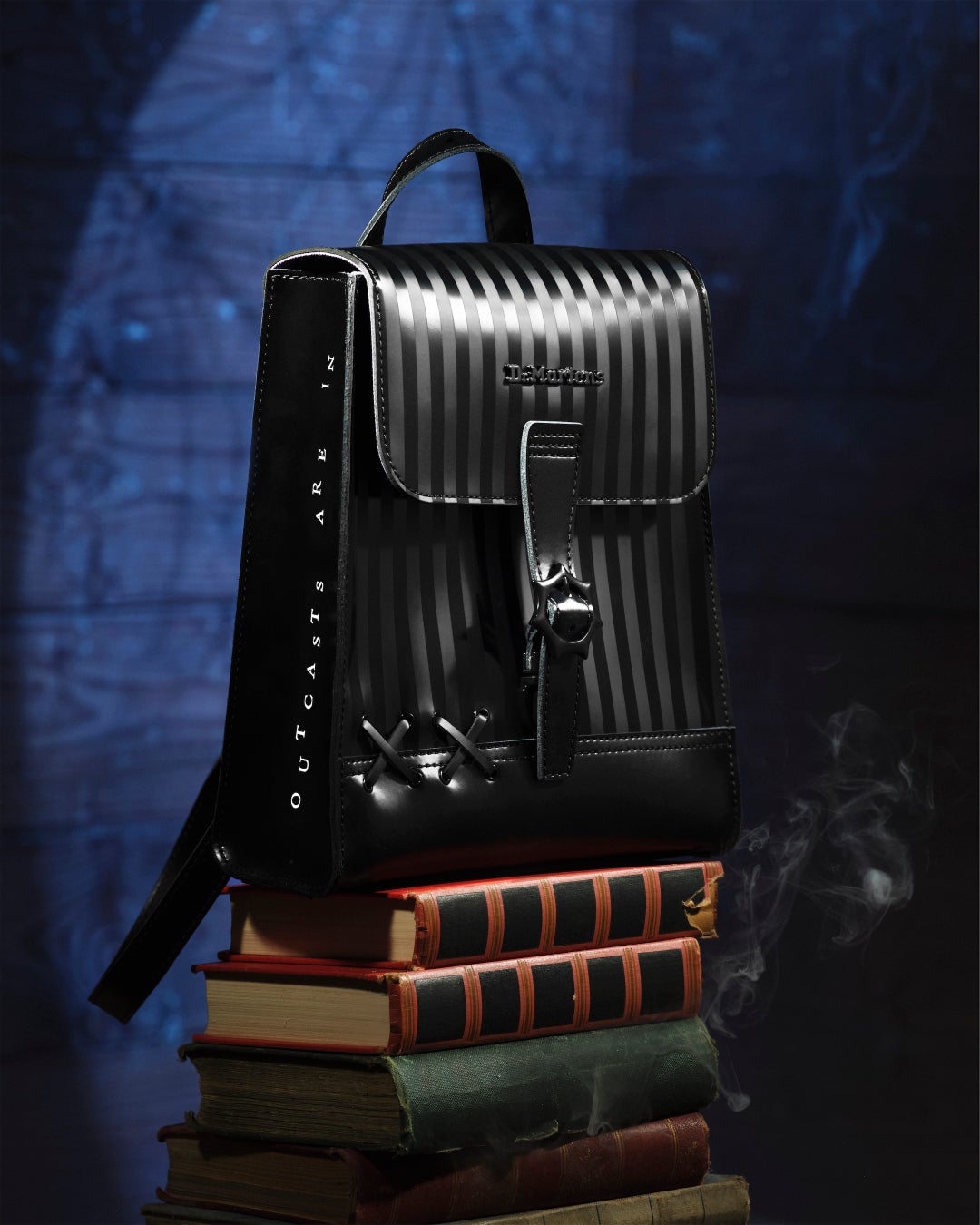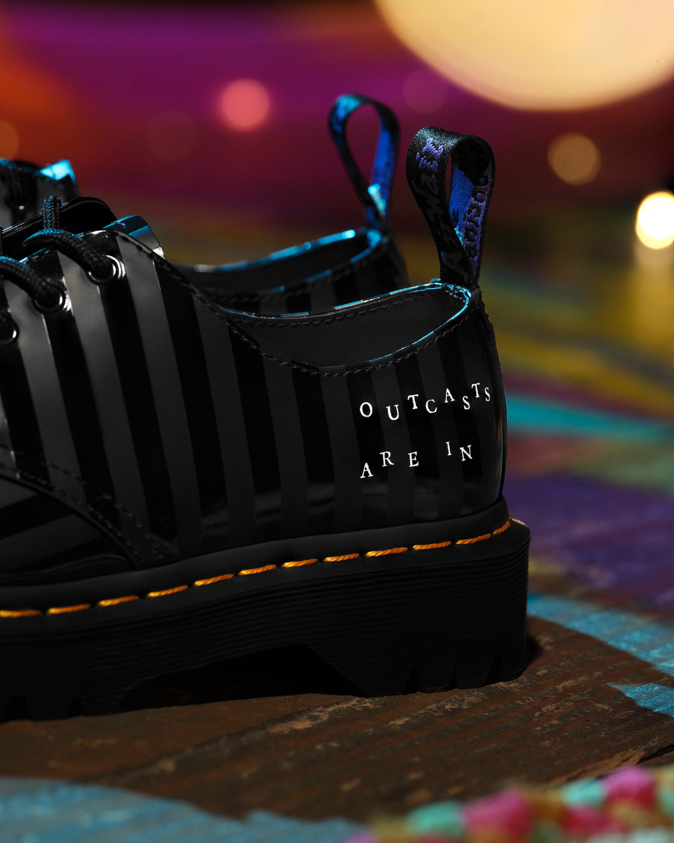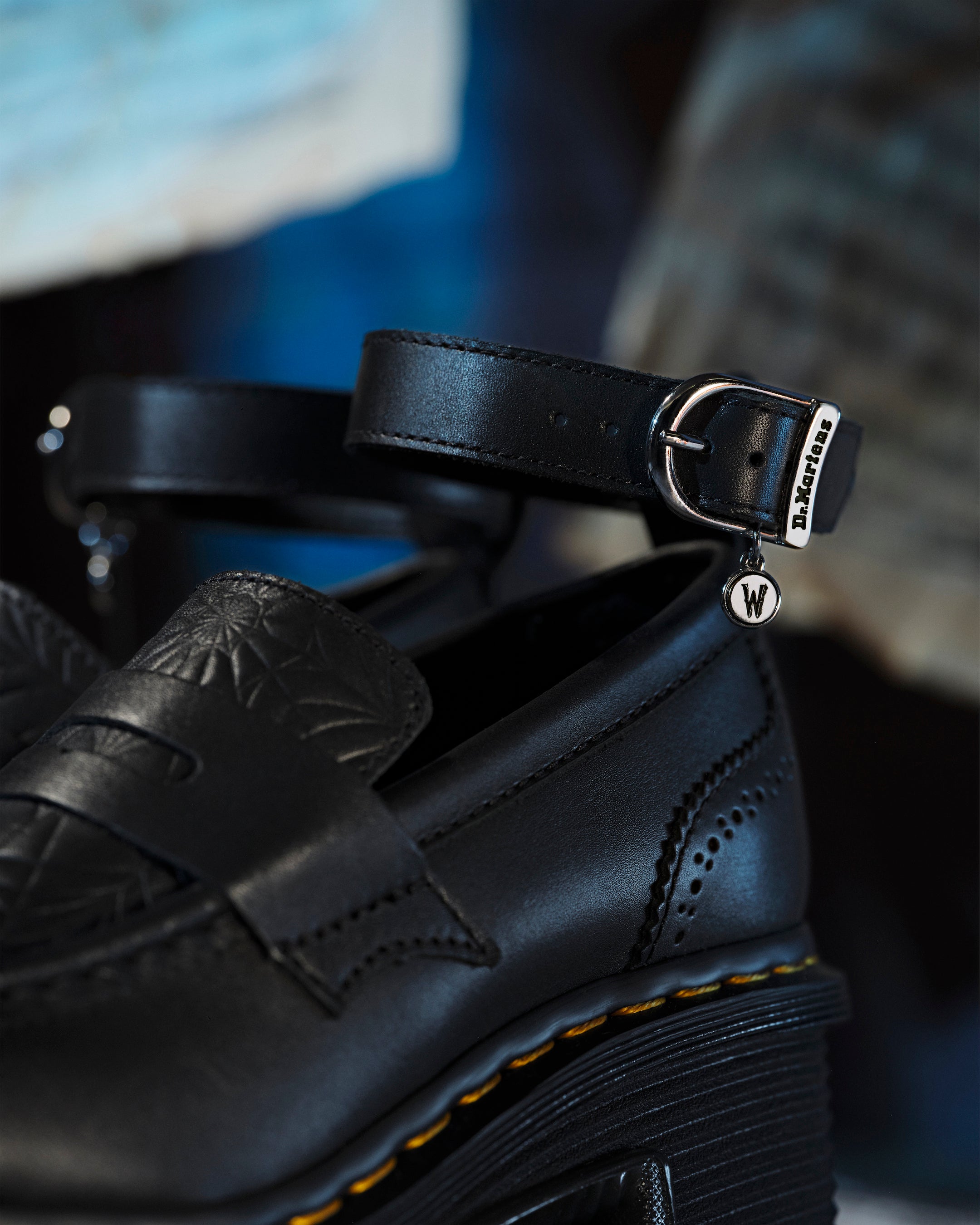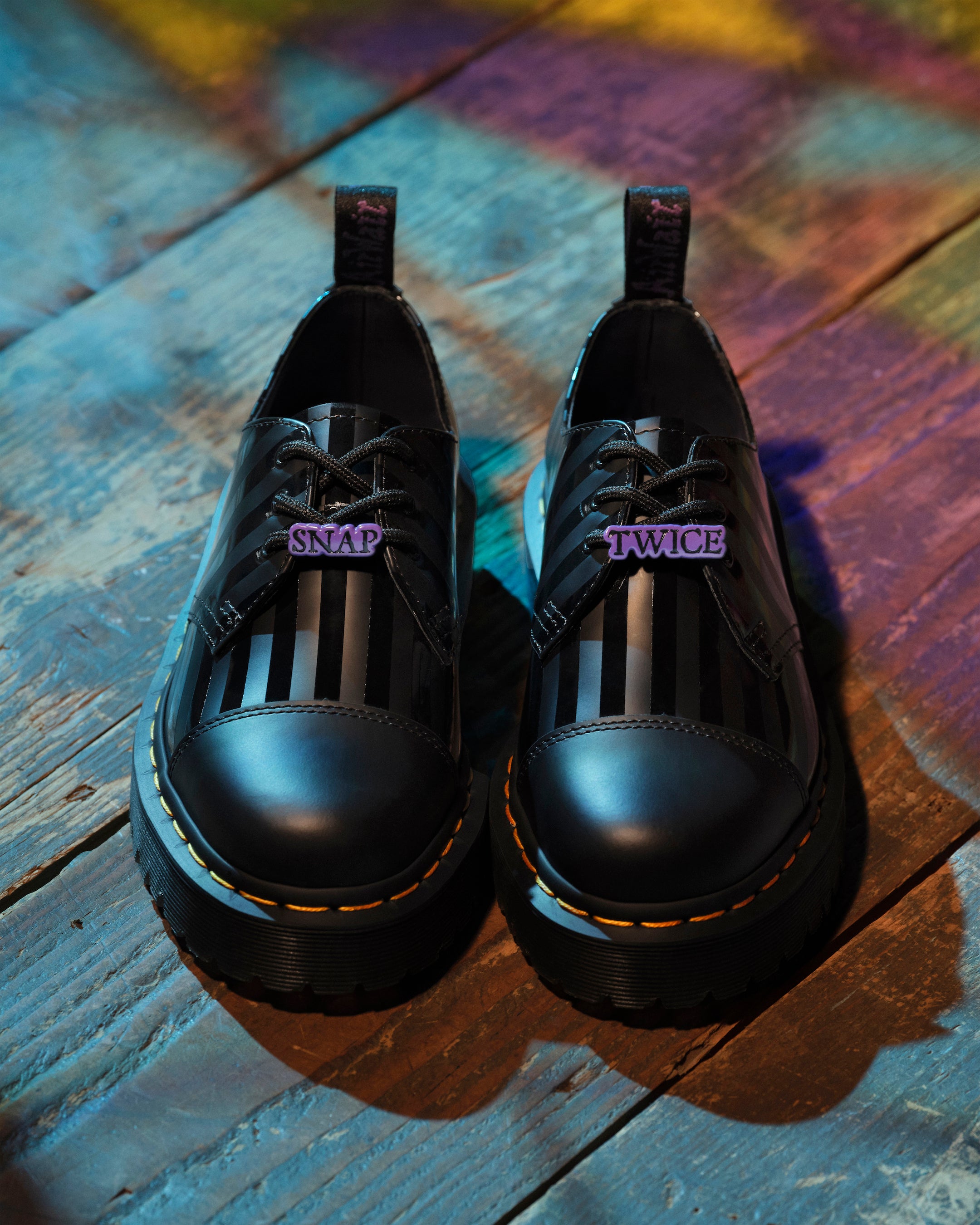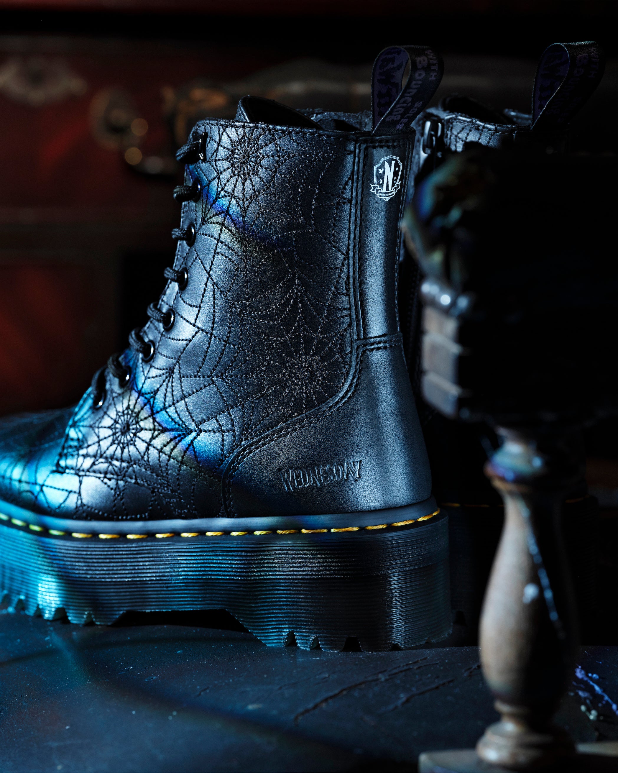 このコラボレーションは、Netflix のカルト的なヒットシリーズにインスパイアされたもので、ウェンズデーのシグネチャーであるミッドナイト・ブラックを基調に、クラシックなドクターマーチンのシルエットに新しいデザインを融合 させたコレクションとなっている。コレクションの注目すべきディテールのひとつは、ウェンズデーとイーニッドの寮の部屋にある、ステンドグラスがあしらわれた窓へのオマージュである。スタイルと個性がぶつかり合いながらも共存する、超個性的な自己表現を落とし込んだデザインが、ディテール随所に落とし込まれている。
