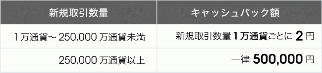 ・新規取引数量が5,000万通貨 ⇒ 10,000円キャッシュバック