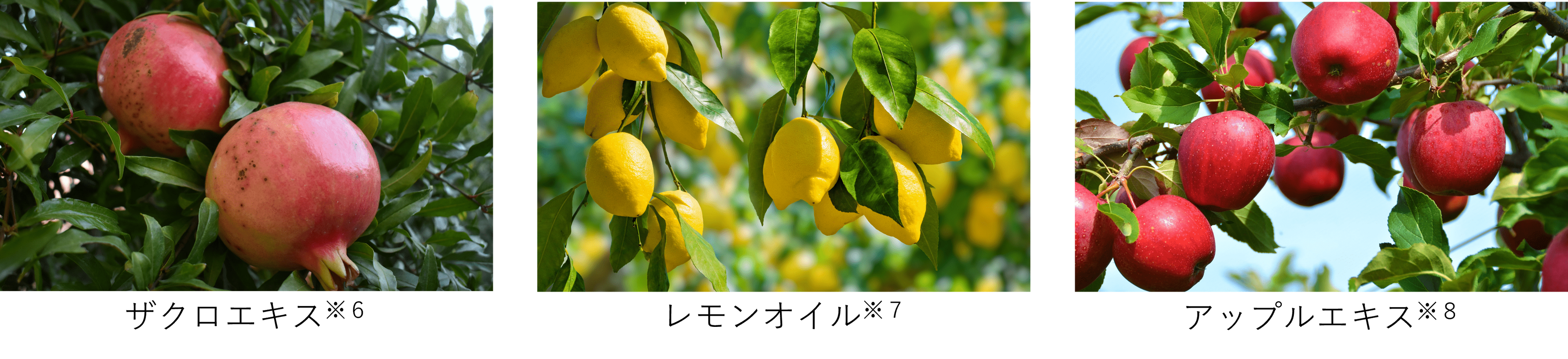 うるおいを与えるザクロエキス※6、肌をさらさらにするレモンオイル※7、キメを整えるアップルエキス※8、3つのフルーツ成分が、うるおいを与えながら肌を整えます。