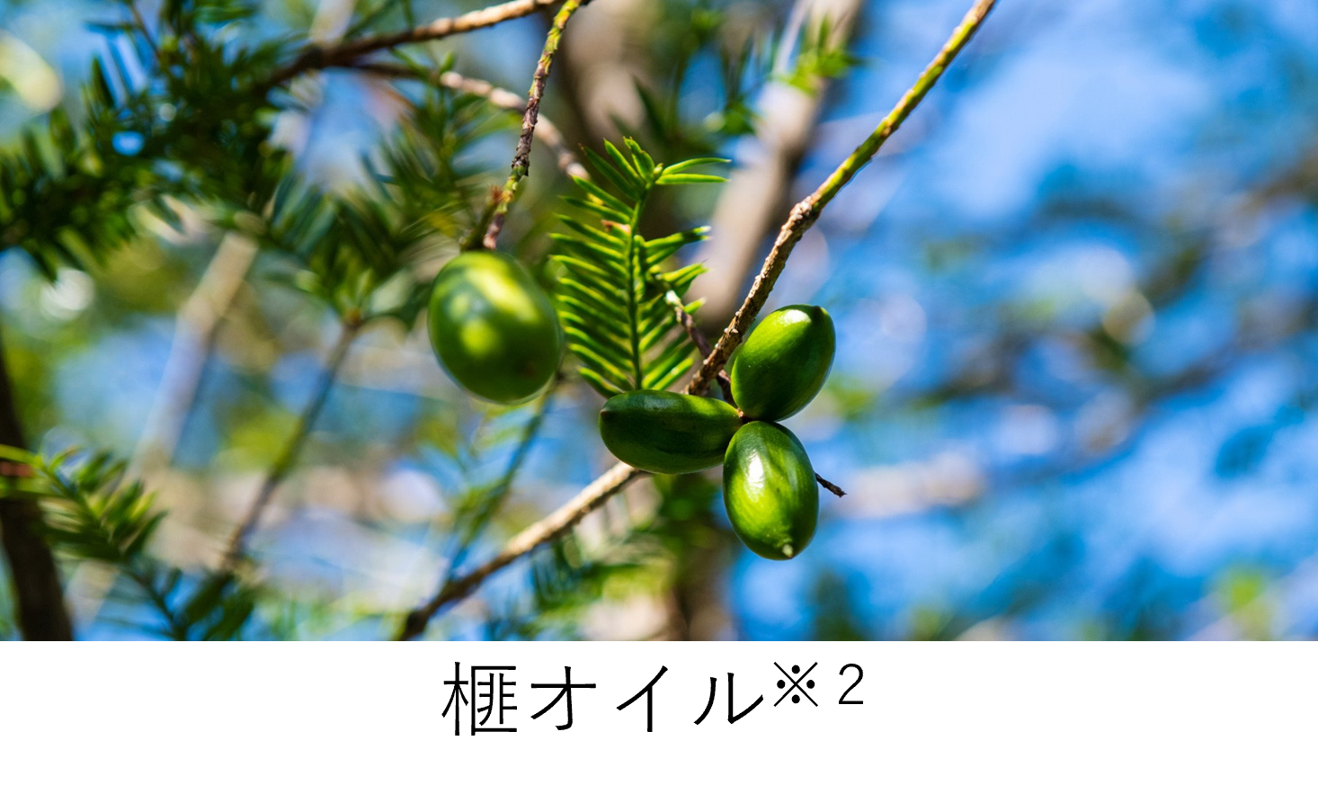 栄養を豊富に含む国産榧オイル。成木になるまで約300年かかるため生産農家が減少し、国内では1か所でしか生産されていないと言われています。貴重な種子から抽出されるオイルは、肌表面にやさしく薄い保湿膜を張ることで、水分の蒸発を防ぎ、長時間うるおいをキープします。榧オイルは、みずみずしい肌へと導き、地方創生にも貢献します。