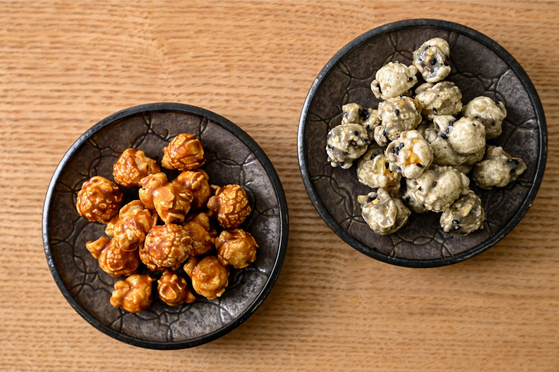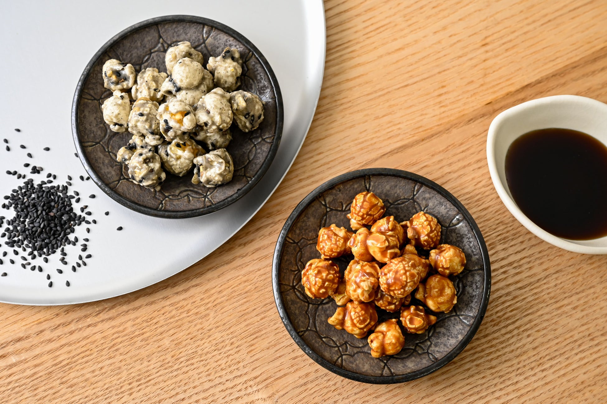 黒みつポップコーン・ごまポップコーン、どちらも日本茶やコーヒー・紅茶にも良く合うのでオススメです。