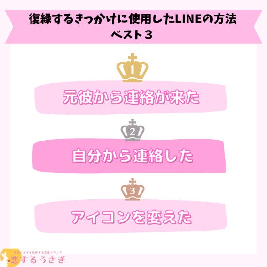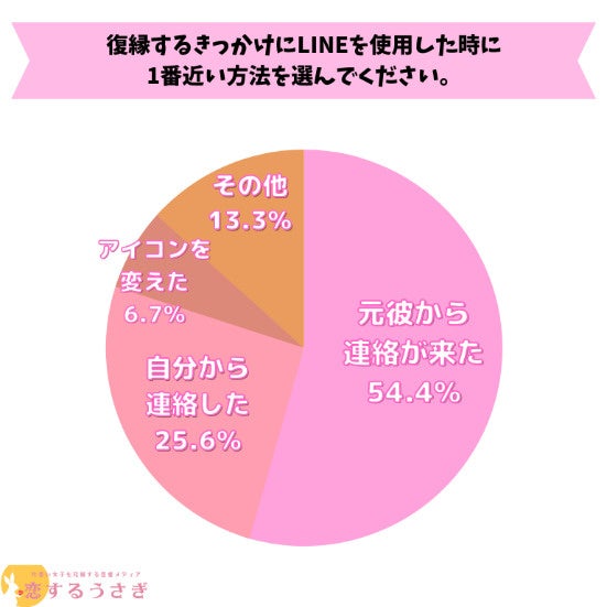恋するうさぎ編集部が行った「復縁するきっかけにLINEを使用した女性成功例と失敗例!」のアンケートによると1位:元彼から連絡が来たが54.4%、 2位:自分から連絡したが25.6%、3位:アイコンを変えたが6.7%という結果になりました。