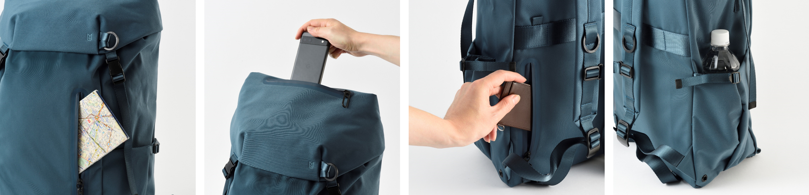 外側にはすぐに取り出したい物を収納するのに便利な3つのポケット、両サイドには折りたたみ傘やボトルを収納できるサイドポ ケットを配置。移動時や混雑時の電車内でも、スマートな物の出し入れをサポートします。