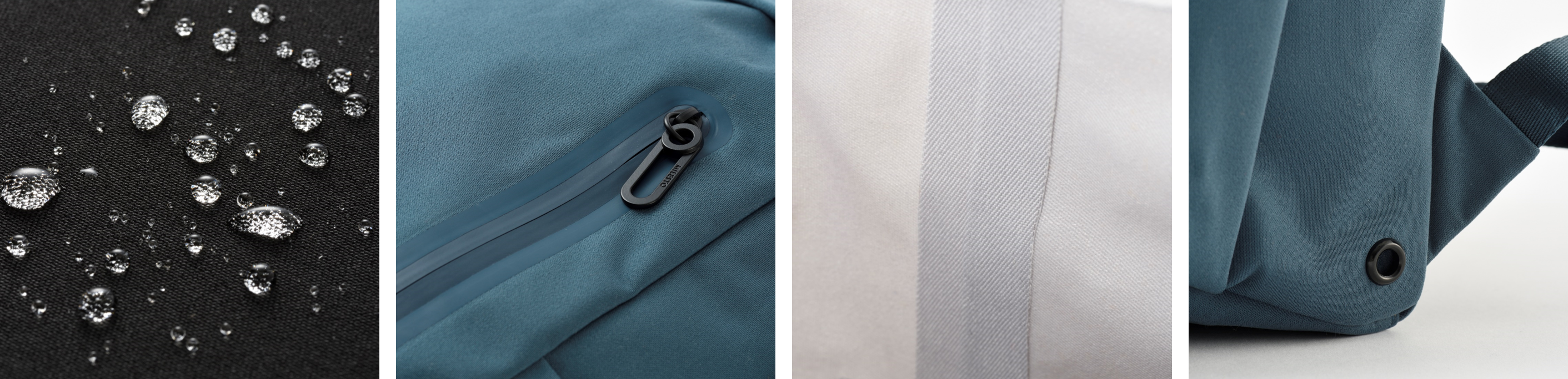 ゲリラ豪雨にも耐える耐水圧25,000mmの強撥水(4級)の柔らかいマット生地を採用。ファスナー部分は無縫製で高周波の圧着を施した止水ファスナーを採用し、縫製部の裏側をシーリング加工することで雨水の侵入を防ぎます。外ポケットには雨水が溜まることを防ぐ水抜き穴を完備。