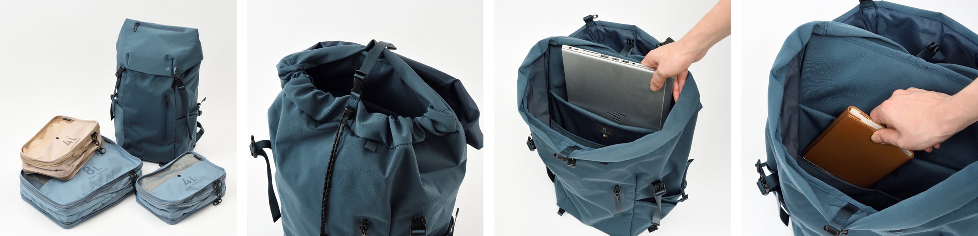2~3泊の旅行でも使用できる最大容量約32Lを採用。メインルームの間口が巾着式になっていることで、中の荷物に合わせて約27~32Lと容量変更が可能。出張にも対応できるよう、メインルームには15インチのPCを収納できるスリーブポケット、仕分けに便利な小物ポケットを搭載。
