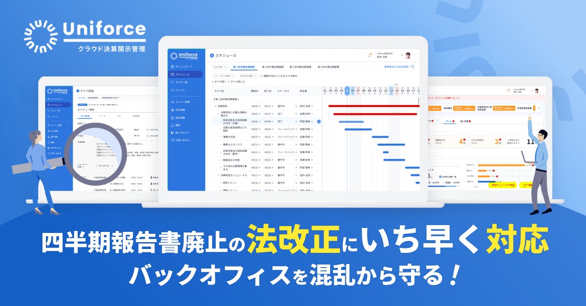 企業フェーズに合わせて持続的な成長の基盤を構築する「ガバナンスグロース」を企業ミッションに掲げ、「ITxコンサルティング」の力でDXを推進するテックカンパニーであるUniforce株式会社(代表取締役CEO:砂田 和也、以下「当社」)は、四半期報告書(第1・第3四半期)廃止の法改正を受け、当社が運営する「クラウド決算開示管理」https://uniforce.co.jp/disclosure/ の機能をアップデートしたことをご報告します。これにより、法改正前のタイミングで余裕をもって準備することができ、直後に予想されるバックオフィス・管理業務での混乱を防ぎます。