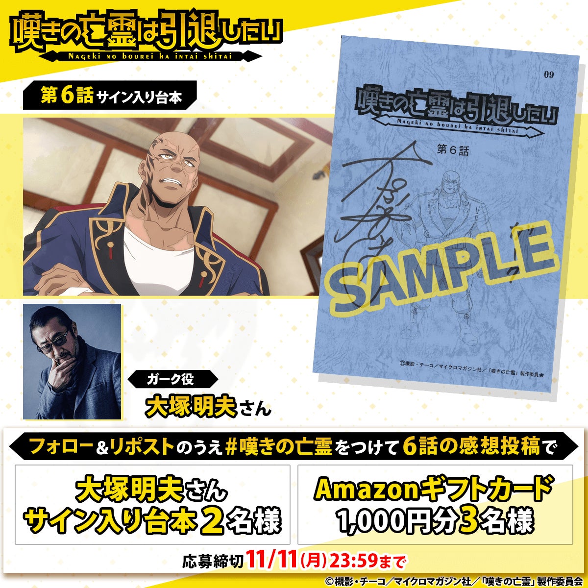 第6話の放送を記念して、大塚明夫さん(ガーク・ヴェルター役)の直筆サイン入り台本やAmazonギフトカード1000円分が当たるキャンペーンを開催いたします。