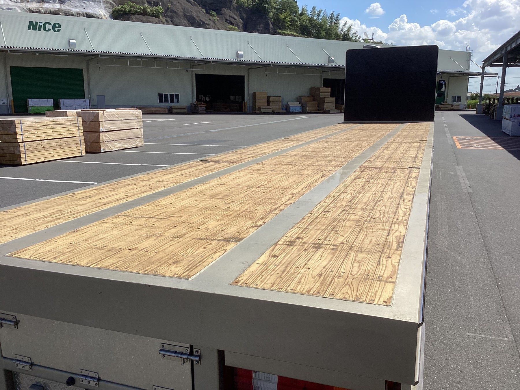 軽量かつ強度の高い「Gywood®」を施した素材をトラックの床板として活用しました。現在トラックの床板で多く用いられている南洋材「アピトン」は高い耐久性や強度を持つものの、2025年に施行される改正クリーンウッド法によって今後入手が困難になる可能性があることなどから、代替木材のニーズが高まりつつあります。表層圧密テクノロジー「Gywood®」により強度を高めたスギ大径木を活用することで、日本国内で素材の調達から加工まで行うことが可能となり、安定的な供給と国産材の利用拡大が見込めます。加えて、スギ本来の軽さを保つ「Gywood®」を施した素材への代替により、トラックの軽量化を図ることができます。これにより、ガソリンの使用量が削減されることで、運搬コストの削減や環境保全の効果が見込めます。今後、トラックやトレーラーにとどまらず、船舶やコンテナ、パレット、航空機などでの活用も期待できます。