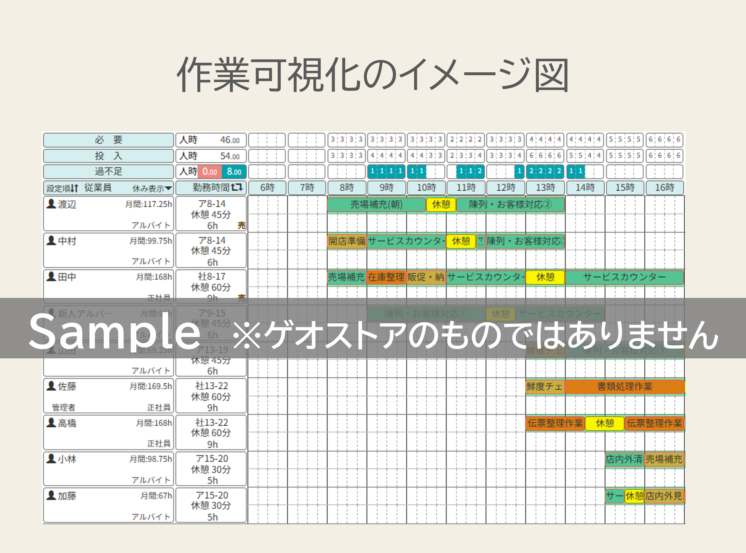 具体的には、その日ごとに“どんな作業”が“だれに”計画されているかが可視化されているため、その采配についてエリアマネージャーが目視でき、店長と会話ができるのです。