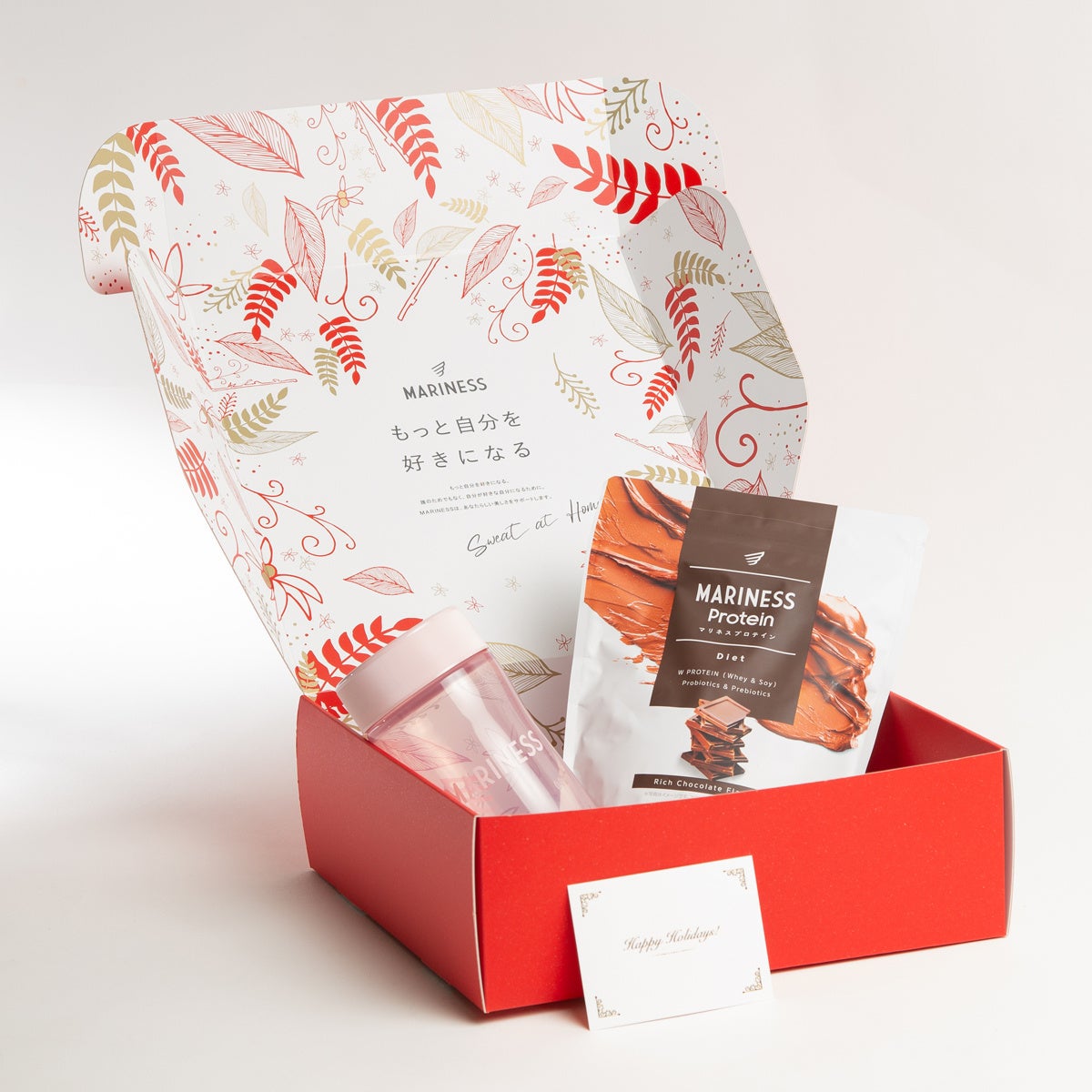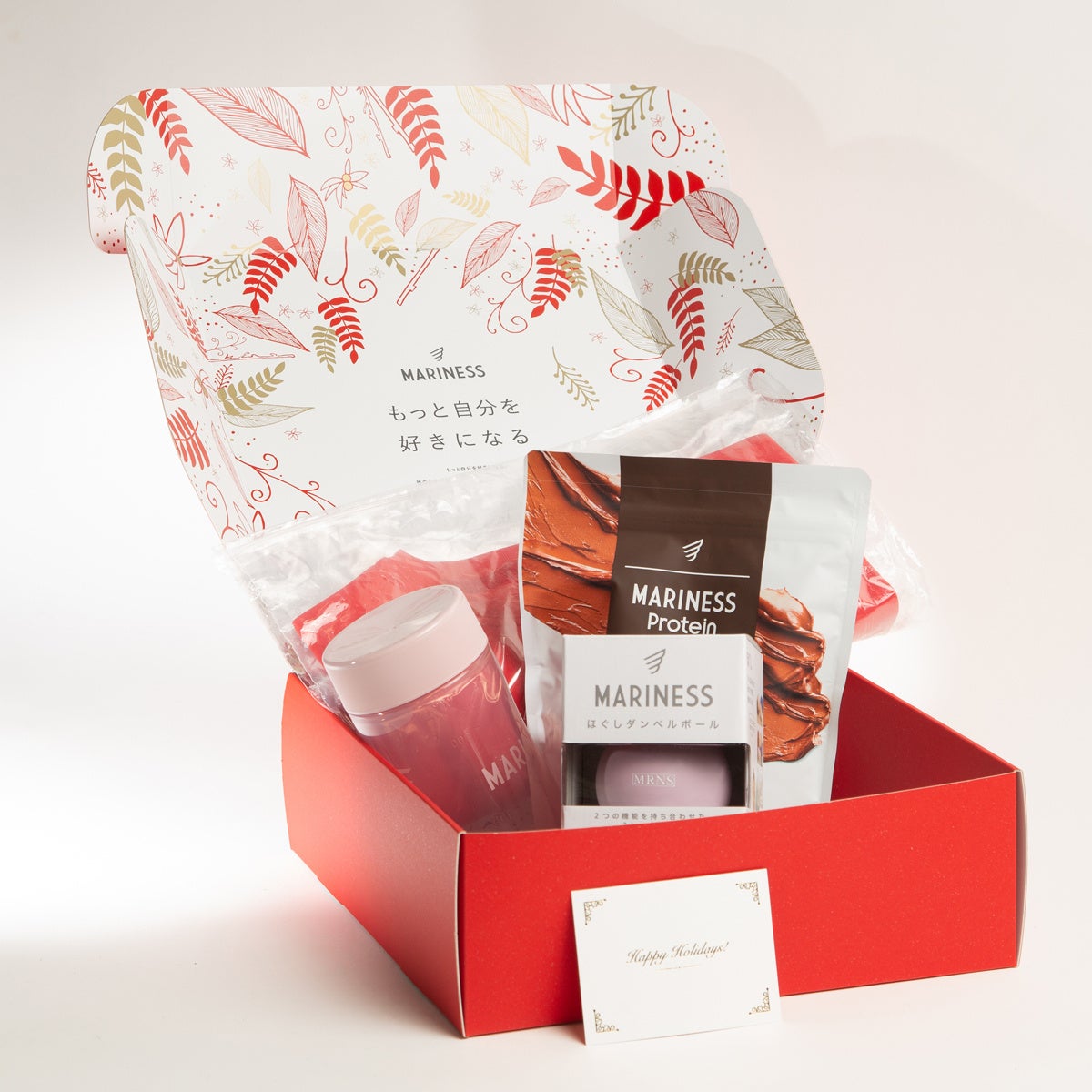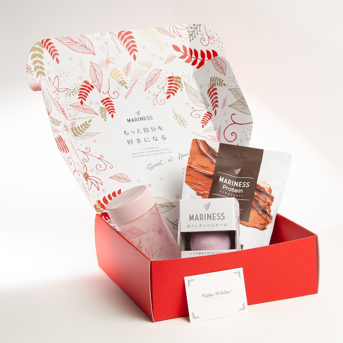 累計販売数35万個(※)を突破した「マリネスプロテイン」や、人気の宅トレグッズがホリデー限定デザインボックスに入ったクリスマスギフトセットは全3種で、中に入れるメッセージカードは2種からお好みの1枚を選んでいただけます。1年間の“ありがとう”の気持ちをマリネスのギフトセットに乗せて大切な人に健康をプレゼントしませんか?
