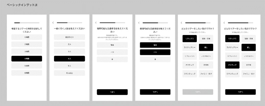 出力される生成ルートパターンを多様化させるべく、選択式でユーザーの状況やニーズ(希望するツアーの時間、気分など)をインプットするUIを設定しました。