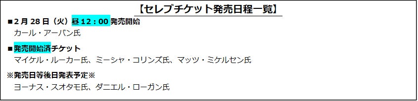 また、先日来日が発表となったヨーナス・スオタモ氏、ダニエル・ローガン氏のセレブチケットに関しては、後日発表させて頂きますので、今しばらくお待ちくださいませ。