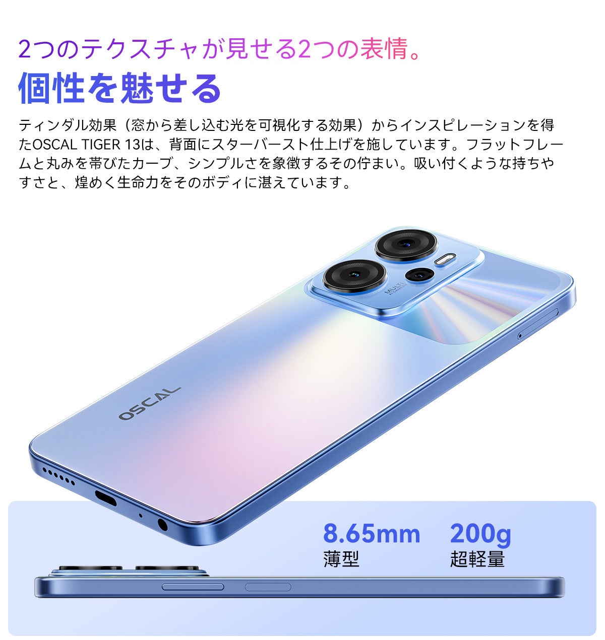 このたびOSCALは、同社の最新スマートフォンである『OSCAL TIGER 13』を発表しました。同ブランドのTIGERシリーズ初となる5G対応スマホであり、AIアルゴリズムを駆使した撮影機能を備え、若者向けに強化されたパフォーマンスとクリエイティブなツールを提供するモデルです。