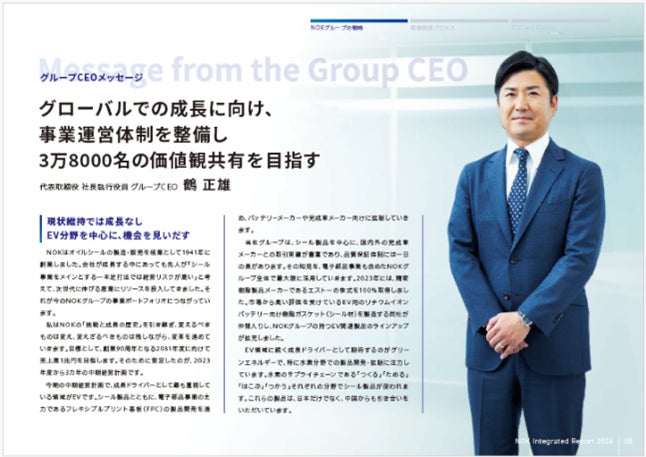 「Essential Core Manufacturing ― 社会に不可欠な中心領域を担うモノづくり」を掲げるNOKは、人が生きていく上で不可欠な「安全」と「快適」を提供しています。本報告書では、事業活動を通じてNOKが提供する価値を創造するプロセス、事業戦略、ESGの取り組みをより分かりやすくまとめました。特にグループCEOメッセージでは、グローバルでの持続的な成長に向け、グループCEO自らが率先して推進する具体的な施策を示しています。