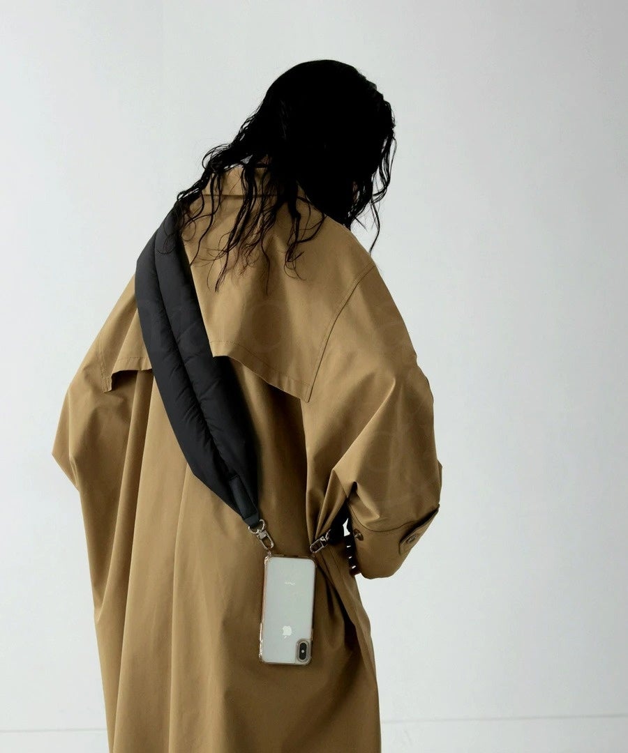 ストラップの幅を広く設計。ぱっと目を惹くデザインでコーデのアクセントとしても機能しながら、中綿入りでふわっと軽い。長く持ち歩いても疲れにくい、これまでになかったスマホショルダーです。
