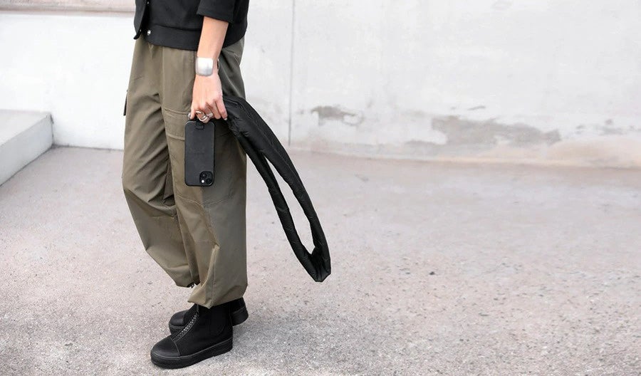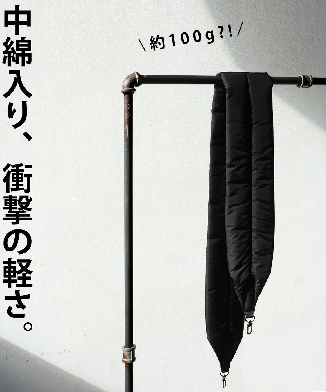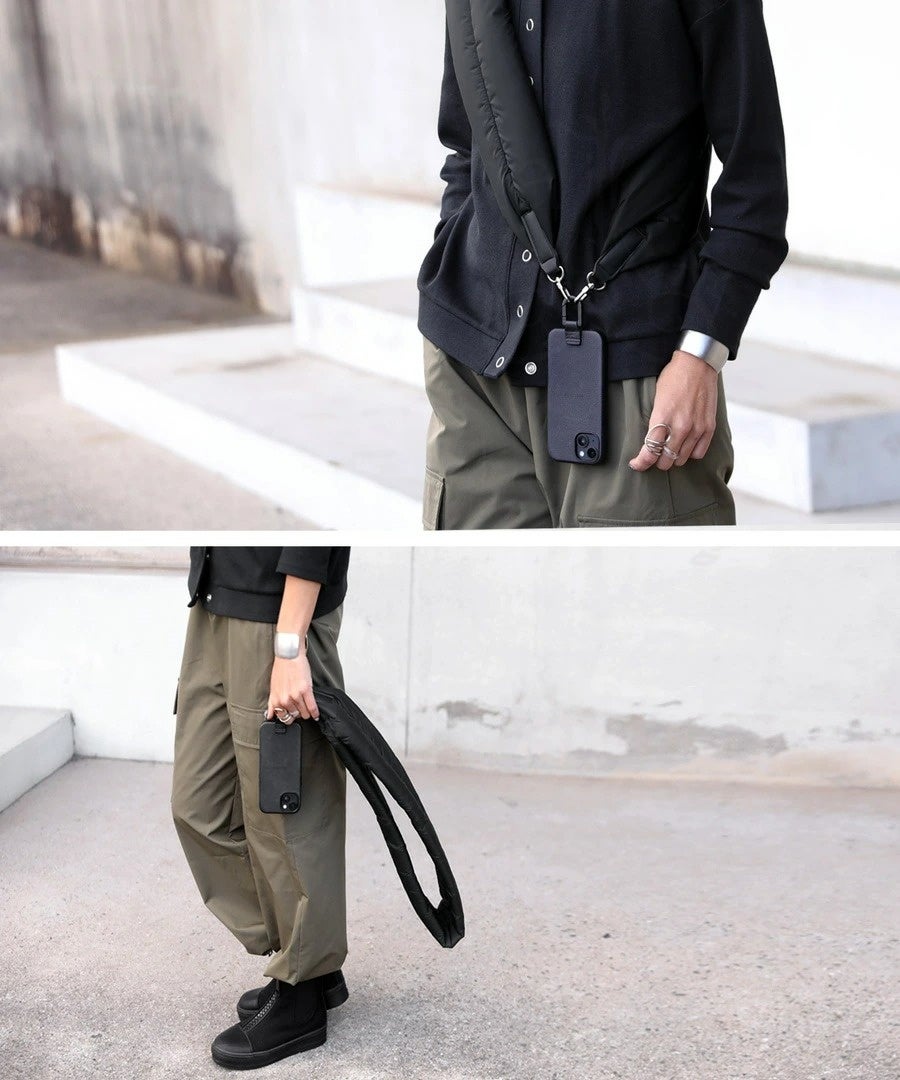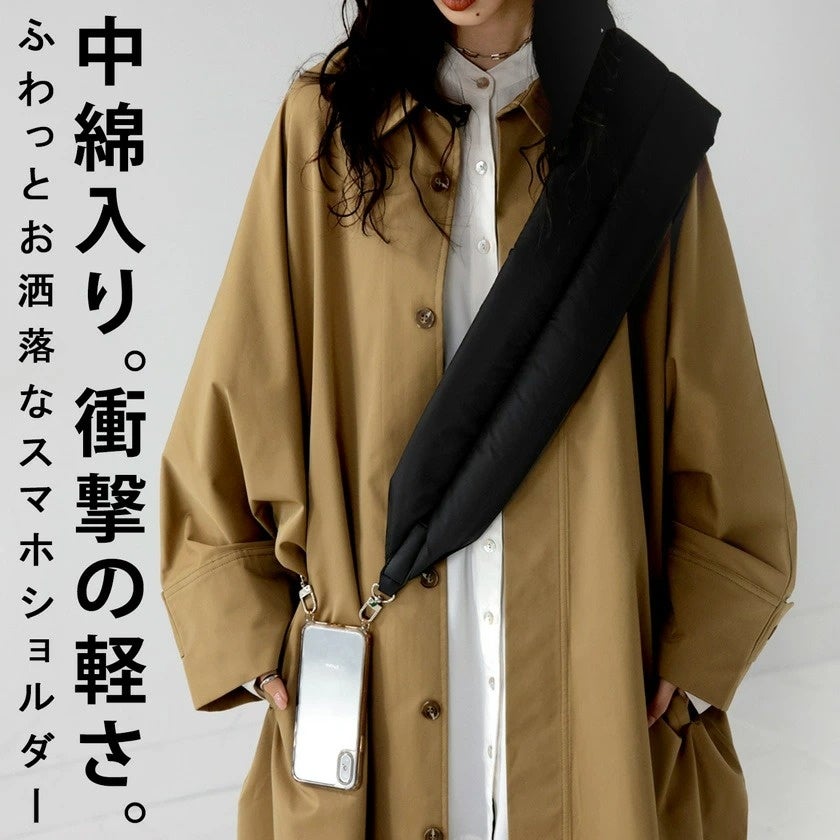 「中綿入りスマホショルダー」は、ぱっと目を惹くデザインでコーデのアクセントとしても機能しながら、中綿入りでまるで身に付けていないようにふわっと軽い、これまでになかったスマホショルダーです。