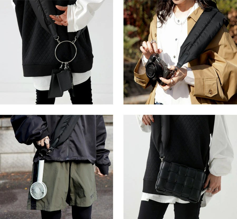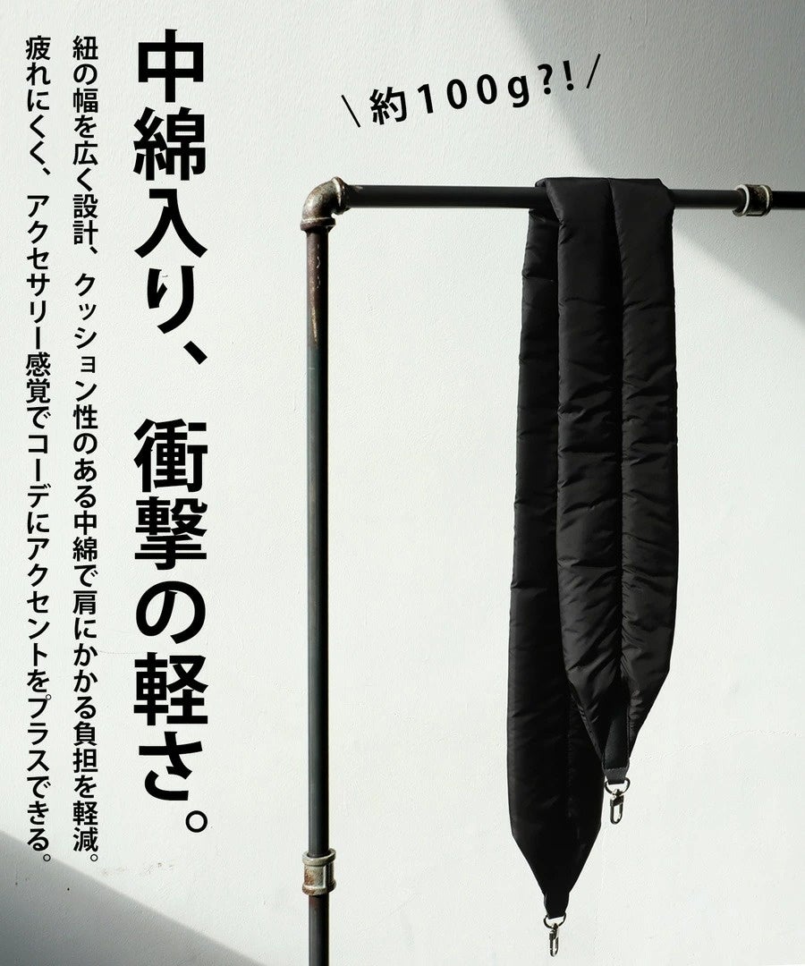 ストラップの幅を広く設計し、クッション性のある中綿入りで肩にかかる負担を軽減。およそ100gという超軽量仕様で長時間持ち歩く場合も疲れにくく、肩こりしづらいのが特徴です。