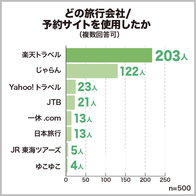 利用されていた旅行会社は「楽天トラベル」が1位でしたが、楽天系列のサービスを利用する人にとってはポイントを有効利用できるという点も大きな魅力となっているようです。