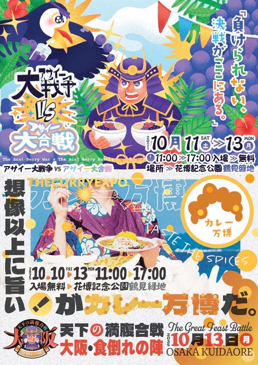 FoodFes株式会社(代表取締役:稲垣一馬)は2025年10月10(金)〜13日(月)に大阪・鶴見緑地公園にて「カレー万博」、「アサイー大戦争VSアサイー大合戦」を開催します!