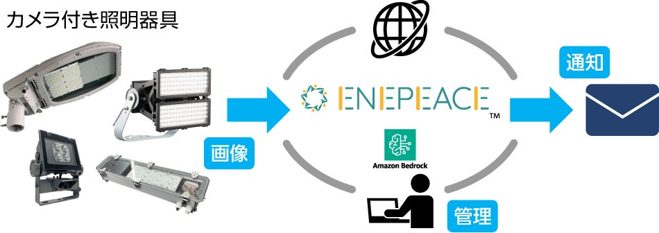 新しく開発された「クラウド型自動監視システム」は、岩崎電気製のカメラ付き照明器具(※3)と「ENEPEACE」、さらに「Amazon Bedrock(アマゾン ベッドロック)」の生成AI技術を基盤としています。