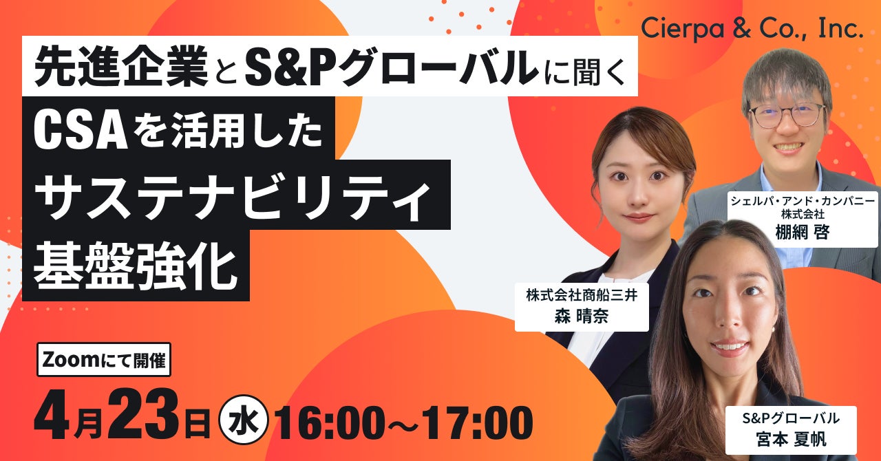 シェルパ・アンド・カンパニー株式会社(本社:東京都品川区、代表取締役CEO 杉本淳、以下シェルパ)は、S&Pグローバルと株式会社商船三井からゲスト登壇者をお招きしたウェビナー『先進企業とS&Pグローバルに聞く!CSAを活用したサステナビリティ基盤強化』を2025年4月23日に実施します。