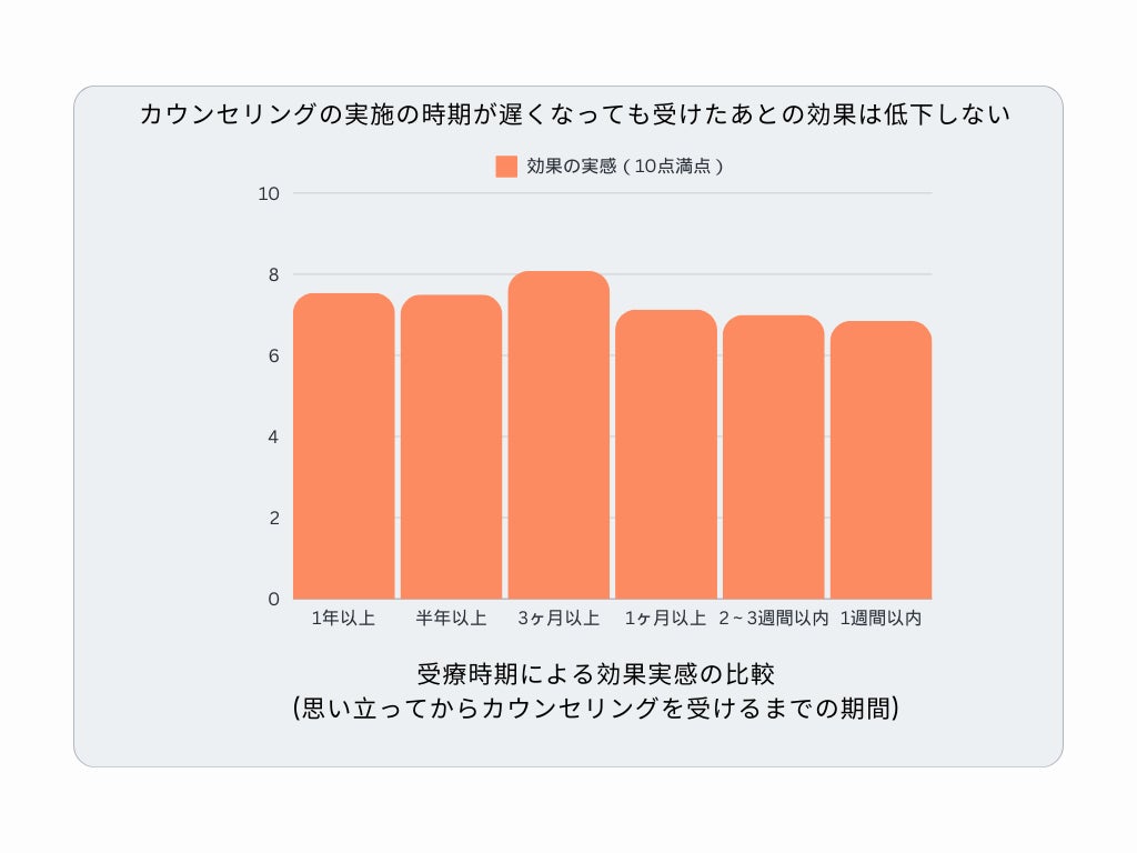 そのアンケート集計結果から、「悩みの発生から時間が経過してもカウンセリングの効果は低下しない」ことが分かりました。