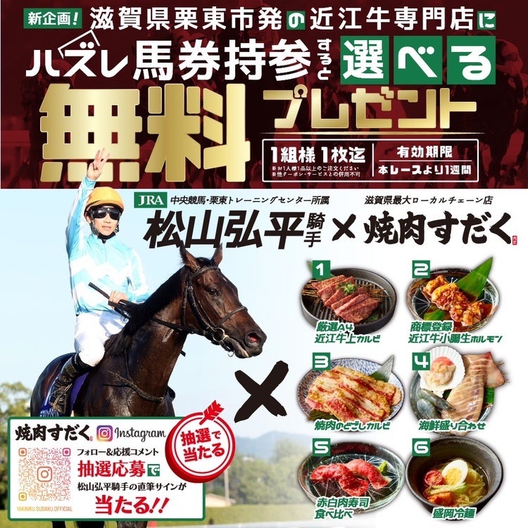 【ハズレ馬券で無料プレゼント!】JRA所属松山弘平騎手×近江焼肉ホルモンすだくのコラボ企画始動