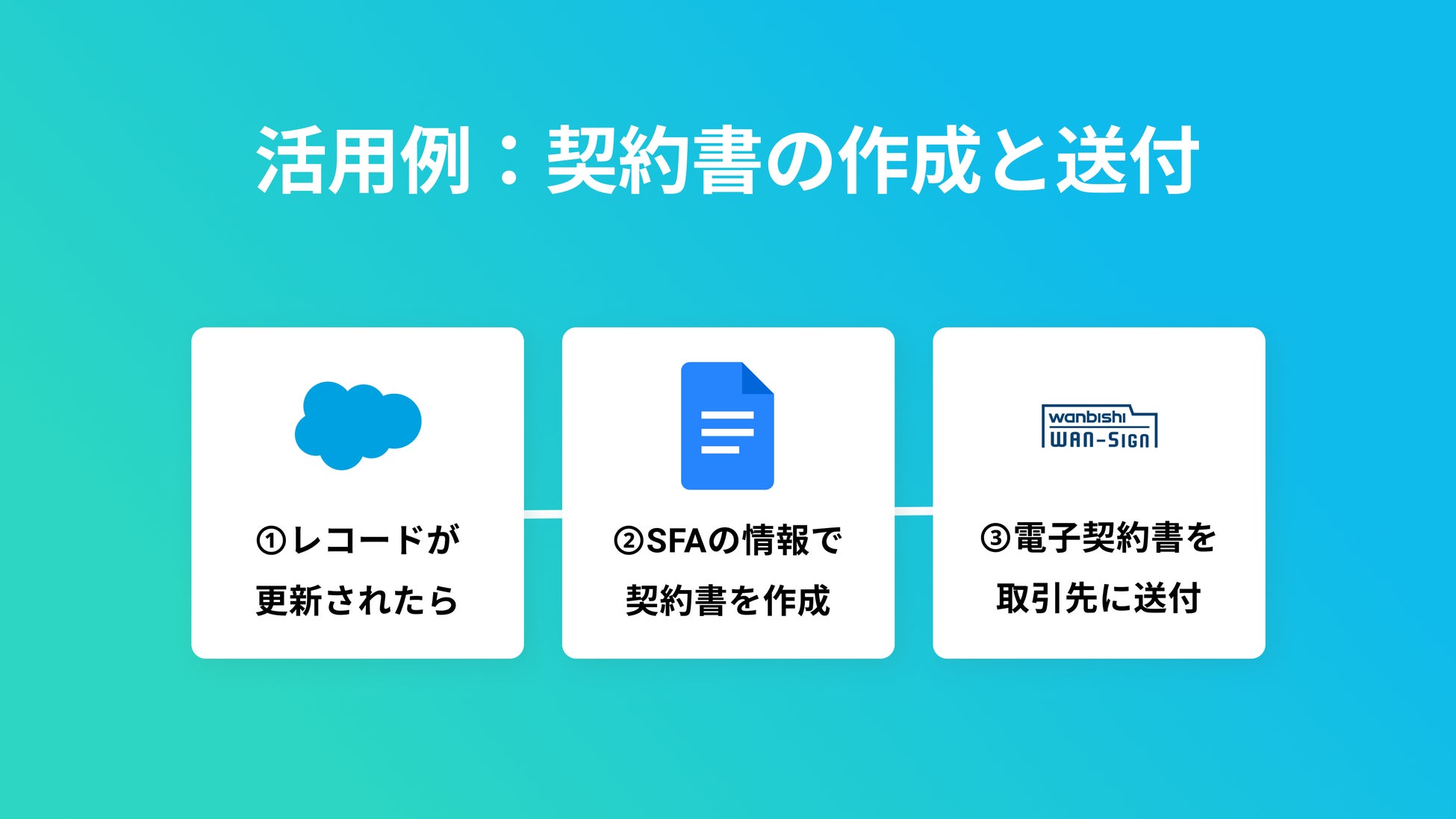 WAN-Signは、書面契約書および電子契約によって締結した契約書の一元管理、さらには書面契約書の原本管理という他にはない電子契約サービスです。今回のAPI連携によりYoomが連携している160種以上のツールとWAN-Signをノーコードでシームレスに連携することができるようになりました。例えば、契約書の作成・送付から契約書情報の管理業務までの一連のフローを自動化することができます。