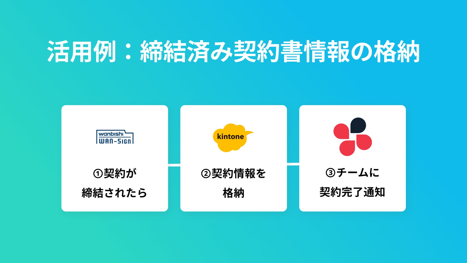WAN-Signで締結が完了した書類情報を取得し、Googleスプレッドシートやkintoneなどに情報を格納し、同時にSlackやChatworkなどのチャットツールに締結が完了したことを通知することが可能です。情報の一元管理とリアルタイムの情報通知で情報管理体制を強化できます。