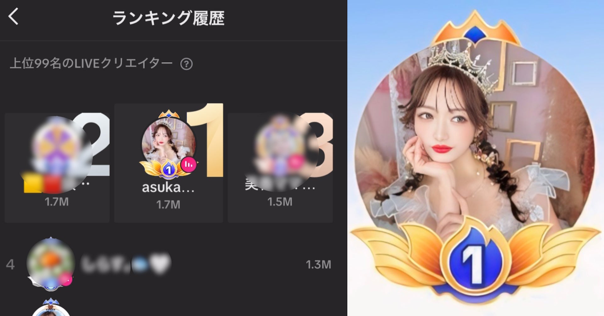 「日間ランキング」は、ライブ配信プラットフォームである「TikTok LIVE(ティックトック ライブ)」内で毎日開催される日間獲得ギフト数ランキングです。このイベントでは、アイテムギフトの「ダイヤモンド」数でランキングが決まります。2024年4/9(火)、RainbowLIVE所属のasuka 首長族がこのランキングイベントに参戦し、激しいランキング争いの末、見事1位に輝きました。