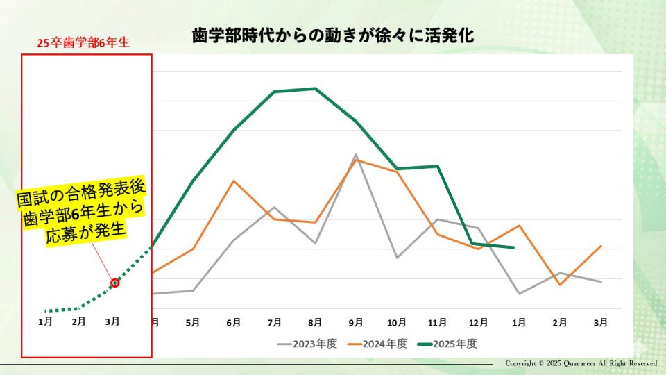 当社の求人サイト「WEBクオキャリア」における応募データを2023年度から2025年度の3カ年で比較分析したところ、新年度(4月)を迎える前の段階から学生のアクションが発生しており、活動開始時期が明確に早まっていることがグラフデータからも読み取れます。