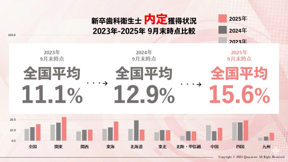 2023年では9月末時点で11.1%だった全国平均内定率は、2024年で12.9%、2025年では15.6%へと伸長しており、学校側の就職指導の前倒しと相まって、より多くの学生が早い段階で就職活動をスタートしている実態が明らかとなりました。