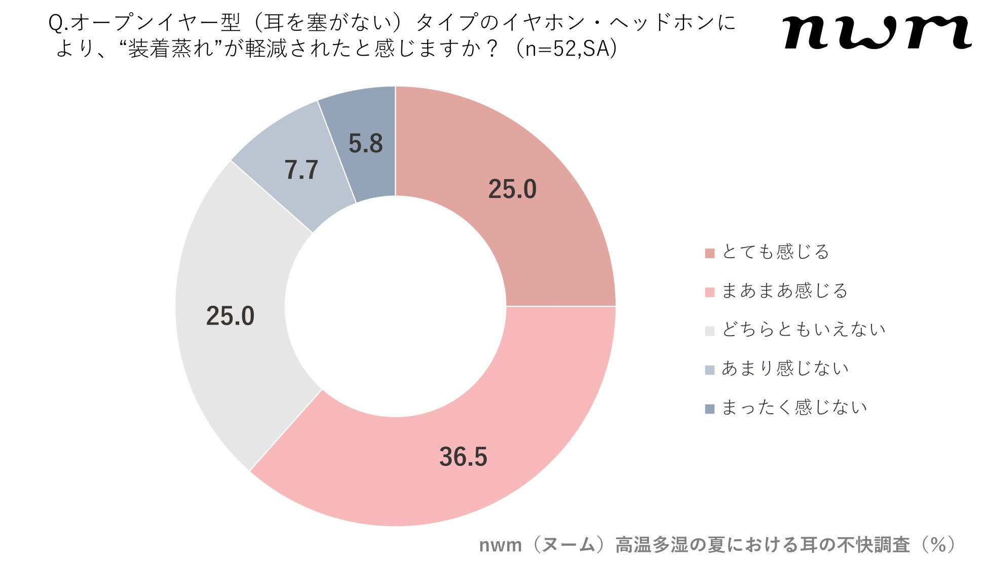 こうした中、オープンイヤー型イヤホンの使用者からは「蒸れの軽減」「耳の中が痒くなりにくい」「清潔を保ちやすい」といった声が多数挙がり、61.5%が“装着時の蒸れが軽減された”と実感しており、耳の不快感を減らす有効な選択肢としての可能性が示されました。