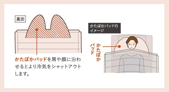 『かけねぶくろんリッチプラス』には、首や肩に沿わせることで冷気をシャットアウトする「かたぽかパッド」が付いています。