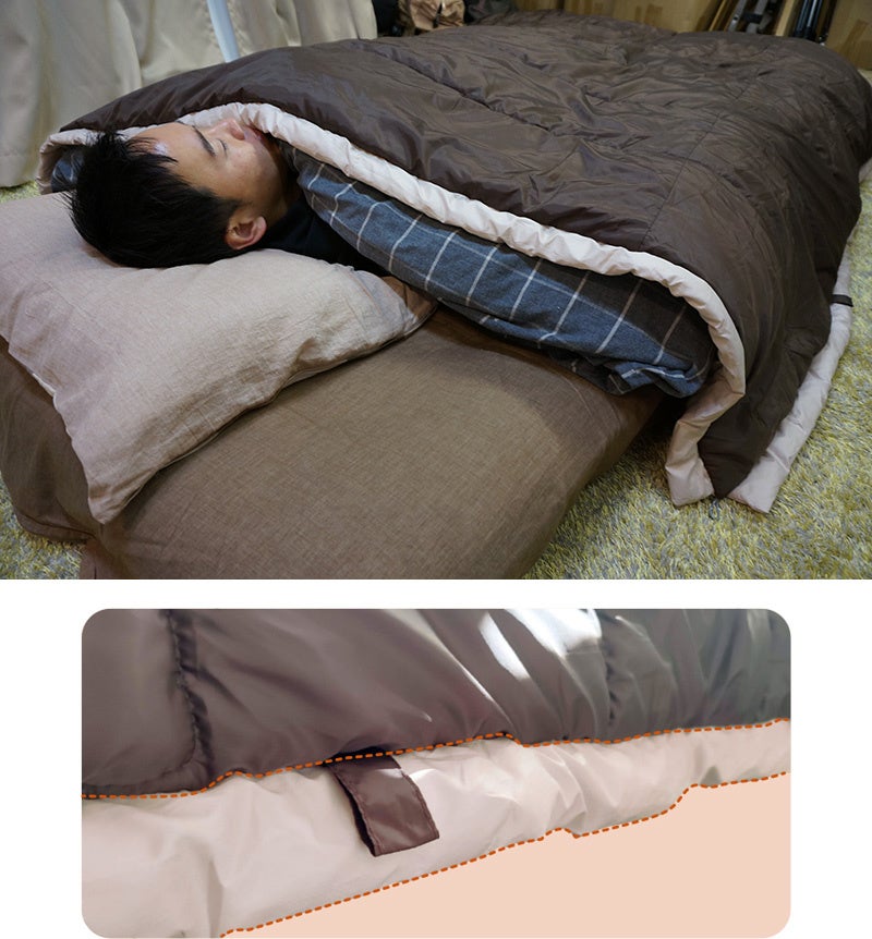 寝袋の生地と中綿を使用することで、耐久性に優れたあたたかいお布団に仕上がりました。