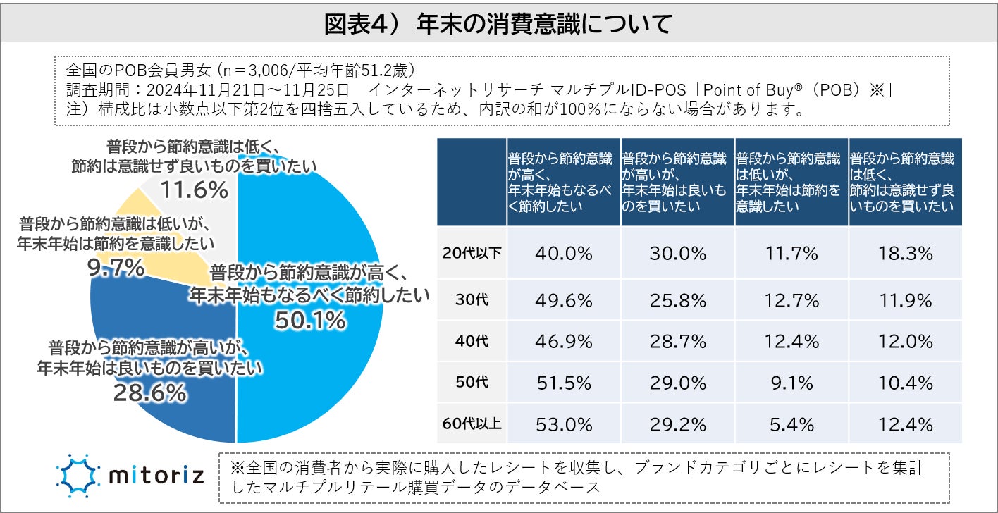「年末年始の消費意識」を調査したところ、最も多かったのは「普段から節約意識が高く、年末年始もなるべく節約したい(50.1%)」となりました。2番目は「普段から節約意識は高いが、年末年始は良いものを買いたい(28.6%)」でしたが、全体的には年末年始だからといって財布の紐を緩めないという考えの人が多いことがわかります(図表4)。