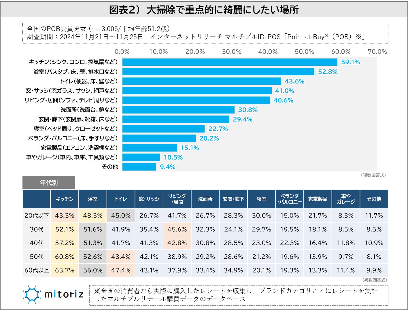 「大掃除で重点的に綺麗にしたい場所」を調査したところ「キッチン(59.1%)」が最も多い結果となりました。次いで「浴室(52.8%)」「トイレ(43.6%)」が続いています。年代別でも20代以下を除いてキッチンが最も選ばれている一方で、20代以下は「浴室(48.3%)」と「トイレ(45.0%)」が「キッチン(43.3%)」よりも上位に入っており、他年代よりも「キッチン」の優先度が低い様子が見て取れます。「窓・サッシ」は年代が上がるほど、一方で「寝室」や「家電製品」は若い年代ほど選ばれている傾向があります(図表2)。