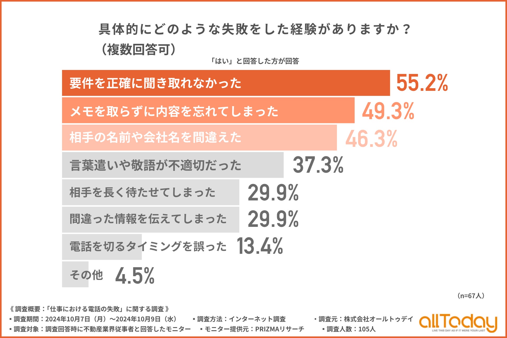 株式会社オールトゥデイ(本社所在地:埼玉県さいたま市)は、不動産業界従事者を対象に、【不動産業界従事者編】「仕事における電話の失敗」に関する調査を実施しましたので、その結果を公表します。