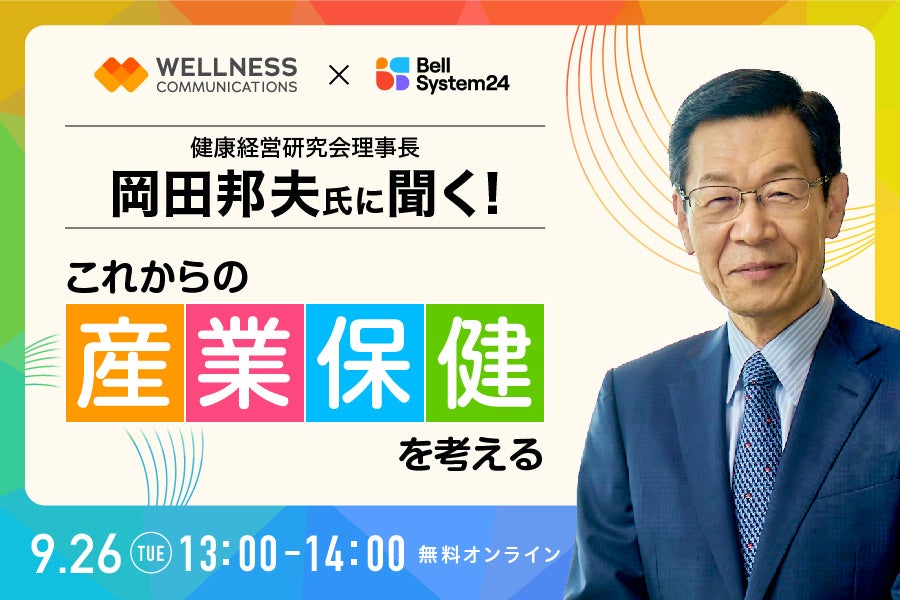 株式会社ベルシステム24(本社:東京都港区、代表取締役 社長執行役員:野田 俊介、以下:ベルシステム24)とウェルネス・コミュニケーションズ株式会社(本社:東京都港区、代表取締役社長:松田 泰秀、以下:ウェルネス・コミュニケーションズ)は、「これからの産業保健を考える~人的資本投資、健康経営推進を通じたウェルネス向上のために~」と題したオンラインセミナー(以下:本セミナー)を、9月26日(火)に開催します。