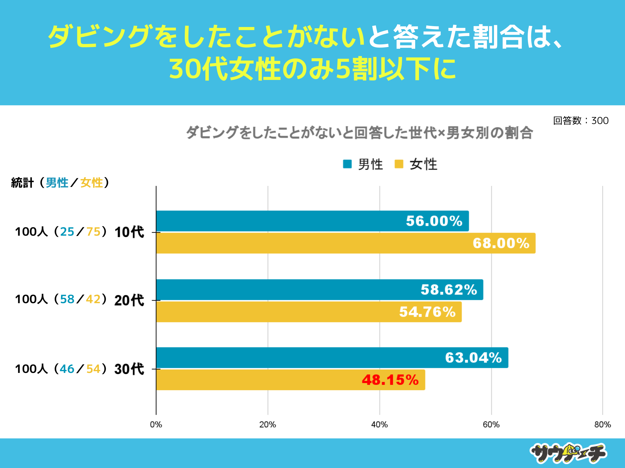 ダビングをしたことがないと回答した割合を世代×男女別でみてみますと、10代女性の68%が最も高く、次いで30代男性の63.04%、20代男性が58.62%、10代男性が56%、20代女性が54.76%、30代女性が48.15%で、30代女性のみ5割以下という結果になりました。