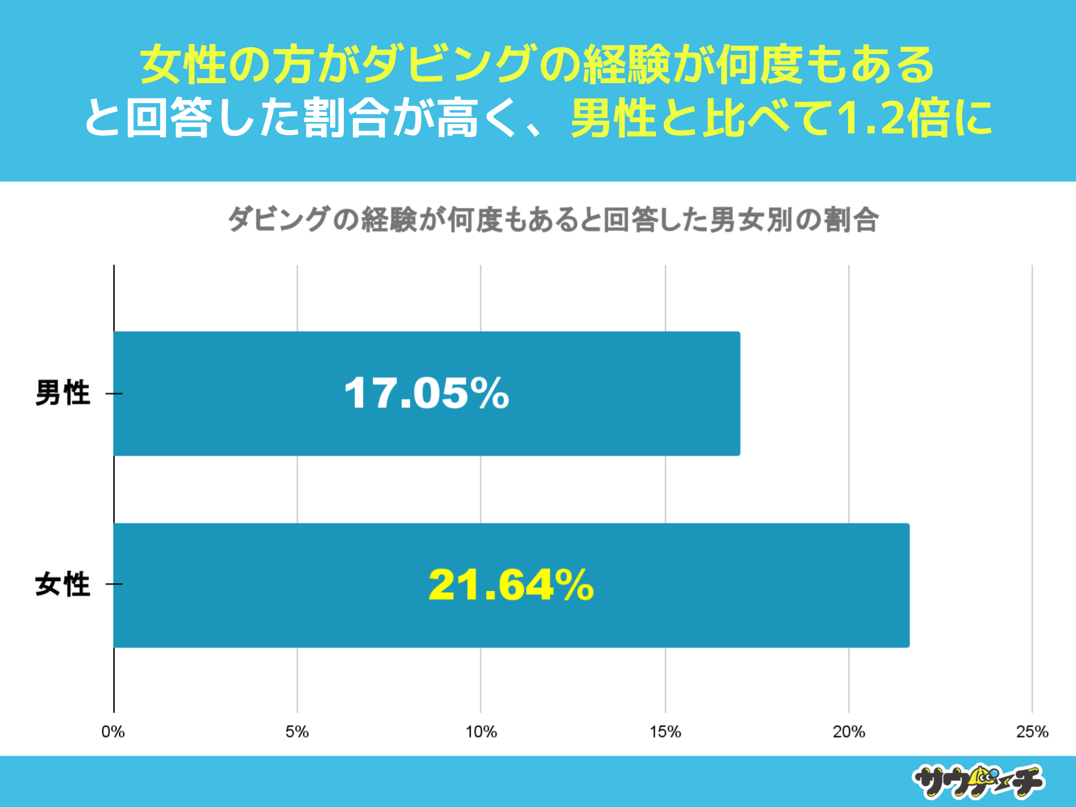 ダビングの経験が何度もあると回答した割合を男女別でみてみますと、女性が21.64%、男性が17.05%で、男性と比べて女性は1.2倍高い結果となりました。