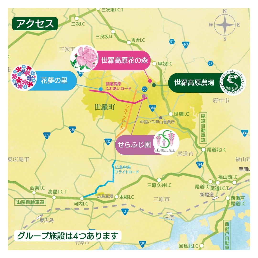世羅高原農場グループには4つの花観光農園があります。今回ご紹介した「秋ローズと花のガーデン」の会場は「そらの花畑世羅高原花の森」です。