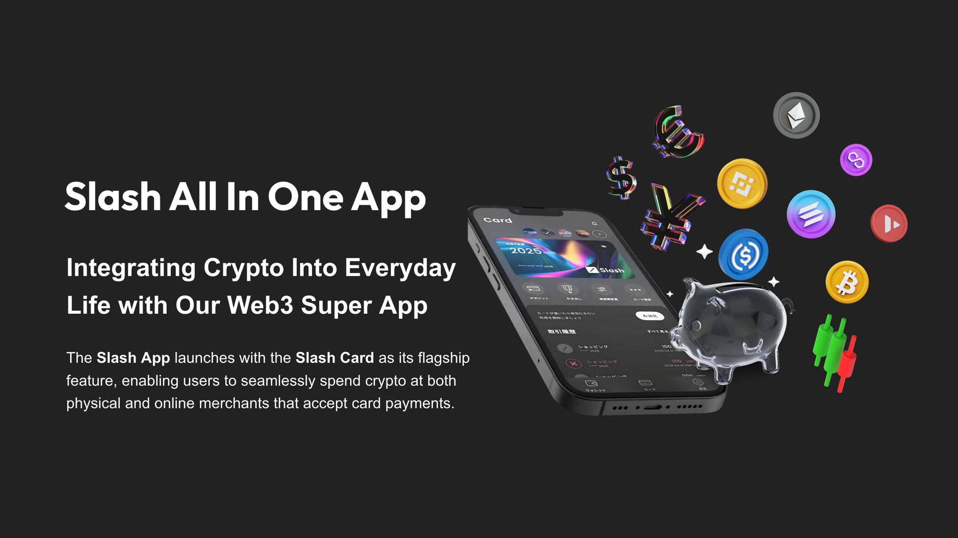 現在、暗号資産全体の時価総額は、3兆4,000億ドル(2024年第4四半期)の規模に成長、日本市場においては暗号資産口座数が1100万口座を突破しており、当社は、2025年前半(6月末まで)に発行を予定している「Slash Card」の開発提供を通じて、暗号資産と現実世界の境界をシームレスに超える新しい決済体験を創出いたします。