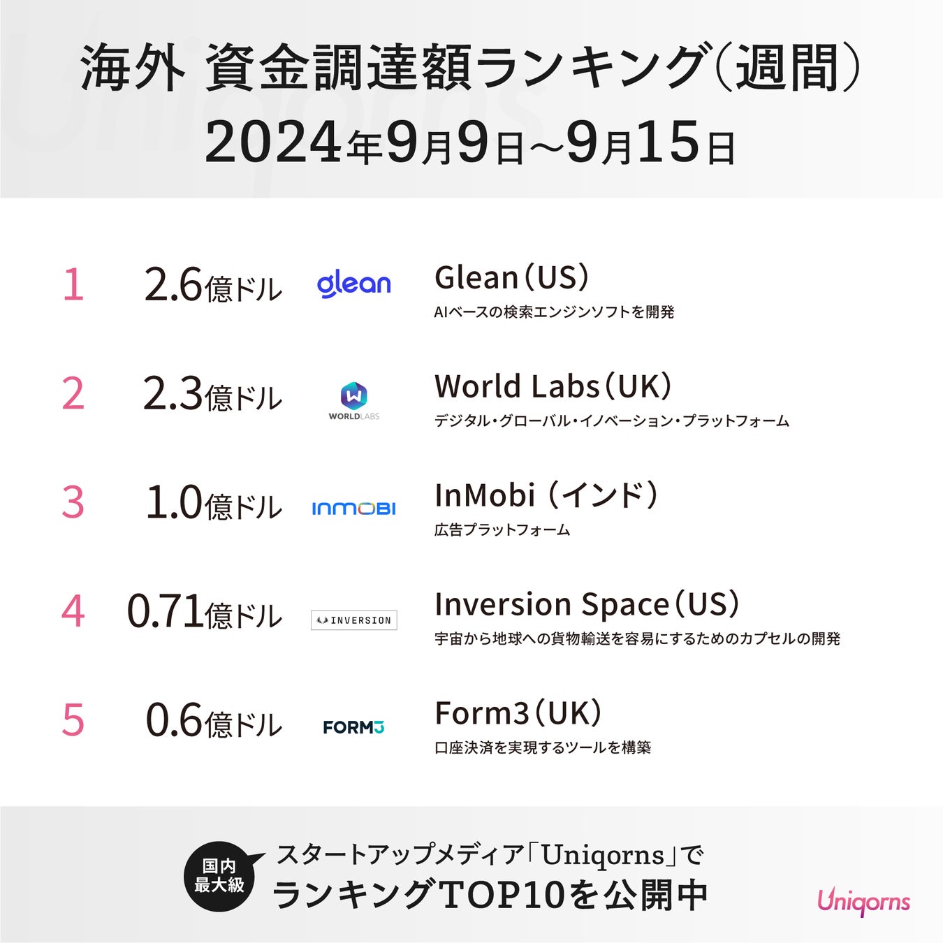 国内最大級のスタートアップメディア「Uniqorns(ユニコーンズ)」が海外2024年9月9日〜9月15日のスタートアップ資金調達状況をランキング形式で発表