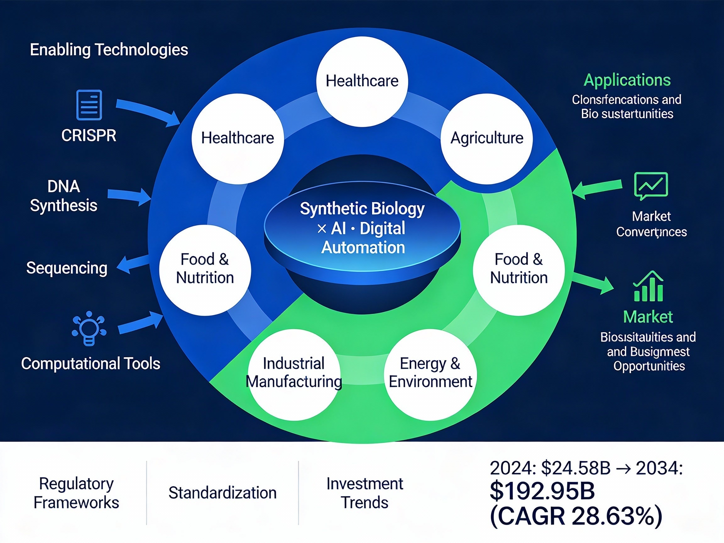 2024年245.8億ドルの合成生物学市場は、2034年に1,929.5億ドル規模(年平均成長率28.63%)へと急拡大する。AI・機械学習・自動化との融合、および医療・農業・工業・エネルギー・環境における横断的な産業応用が、これまでのバイオテクノロジーを超える「次世代バイオプラットフォーム」へと進化させている。
