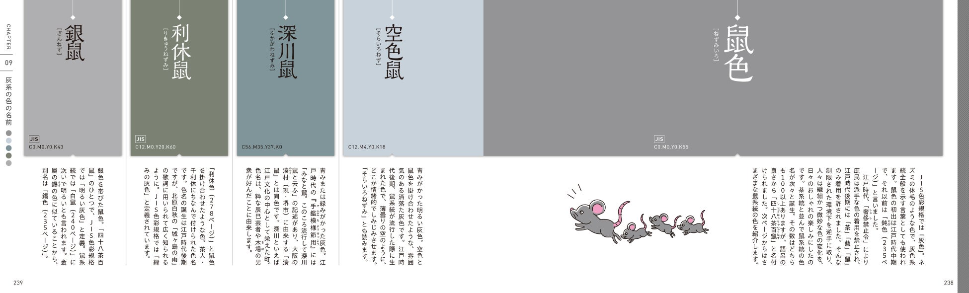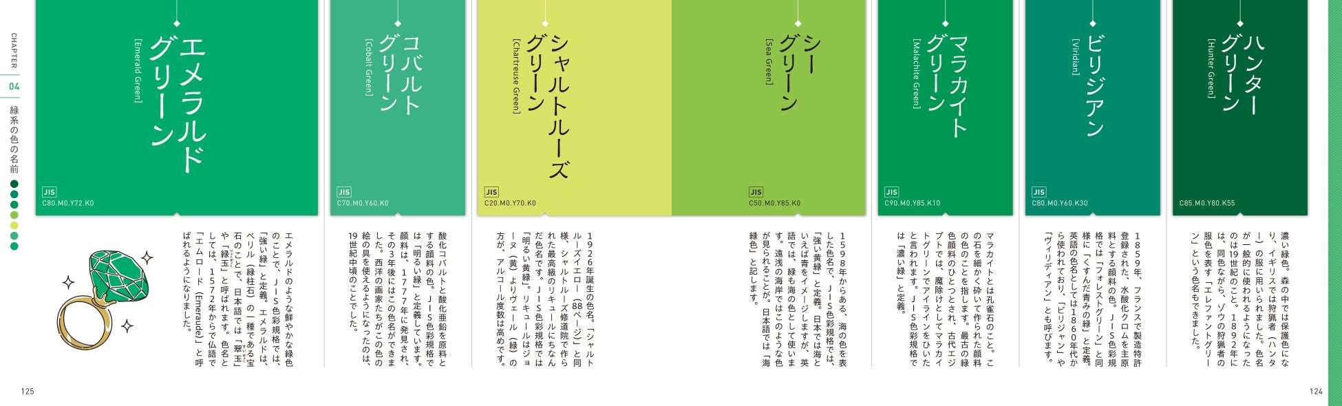 それぞれの「色」や「色の名前」の由来や物語をたっぷりと楽しむことができるほか、色見本では色イメージを感じたり、繊細な色みの差異を数値で確認できるようになっています。
