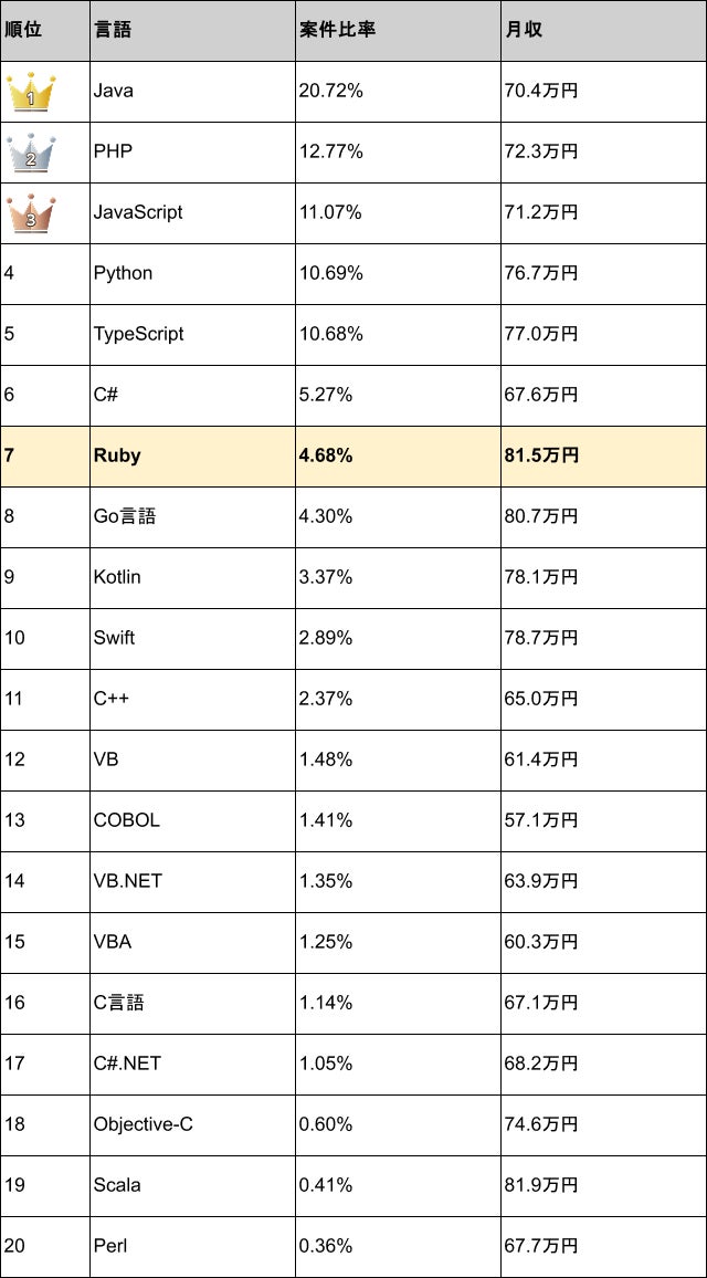 2025年10月時点でRubyの案件は市場全体の4.68%を占め、案件数は7位、平均月額単価は81.5万円と安定しています。