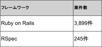 2025年10月時点のRubyフレームワーク別案件数では、1位がRuby on Railsで3,899件、2位がRSpecで245件です。